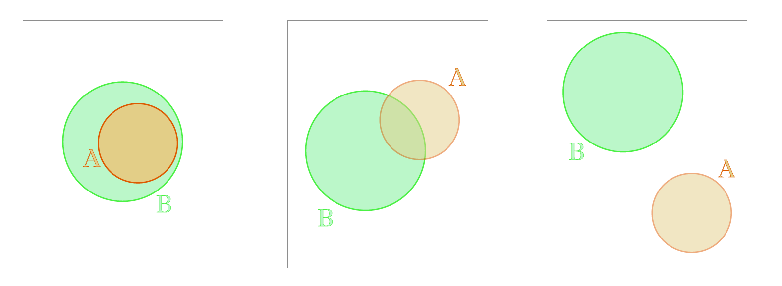 We have completely contained, overlapping but not contained, and completely disjoint. Disjoint means none of the points in circle A is also in circle B, i.e. they do not overlap at all.